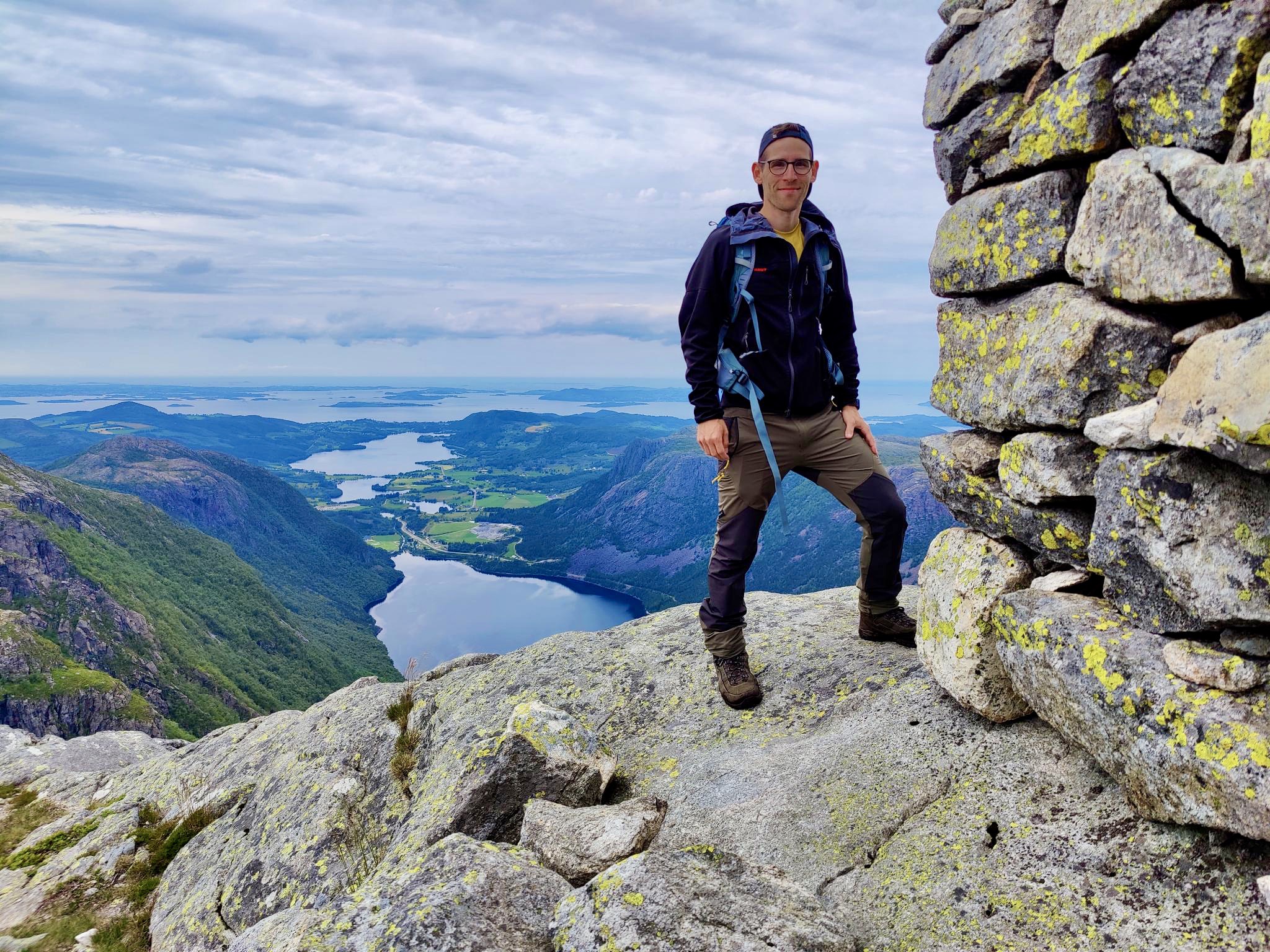 On the way to the summit we meet only two other hikers and a bunch of sheep, and thus have the peak all to ourselves. It offers great views onto the Tysdalsvatnet lake and on the day of our hike is perfectly windstill.