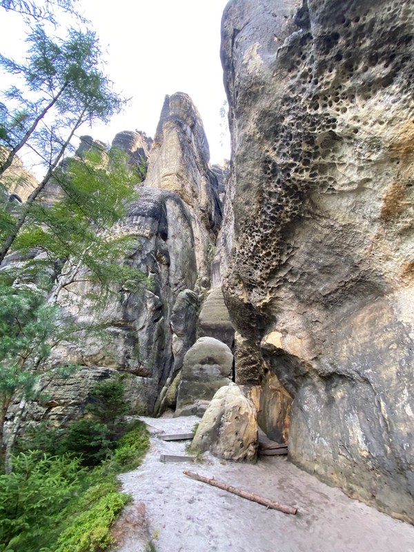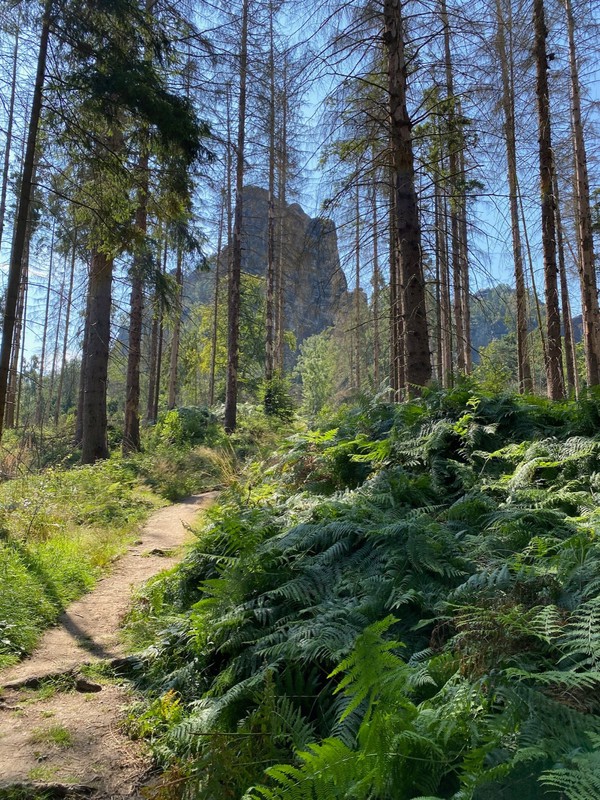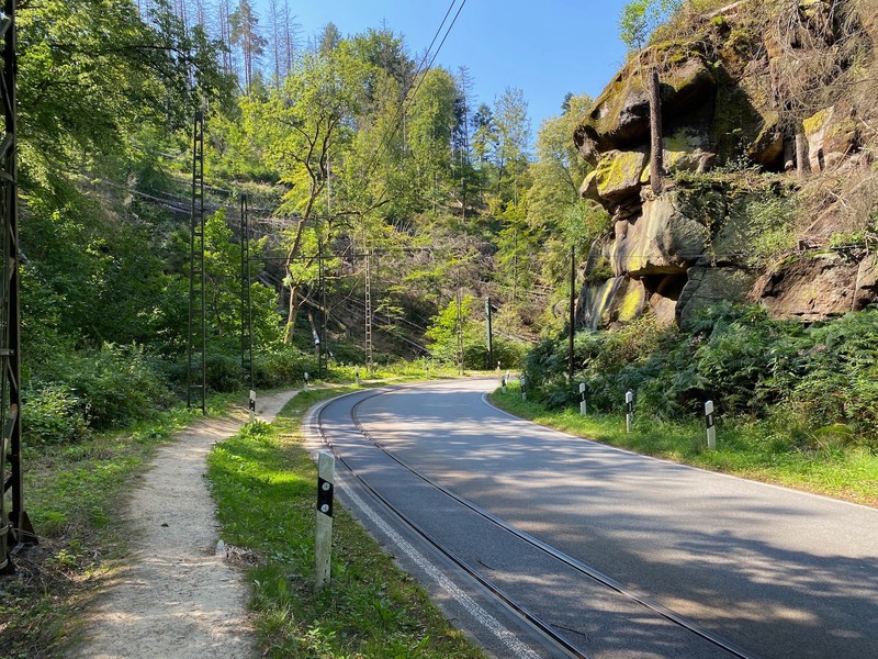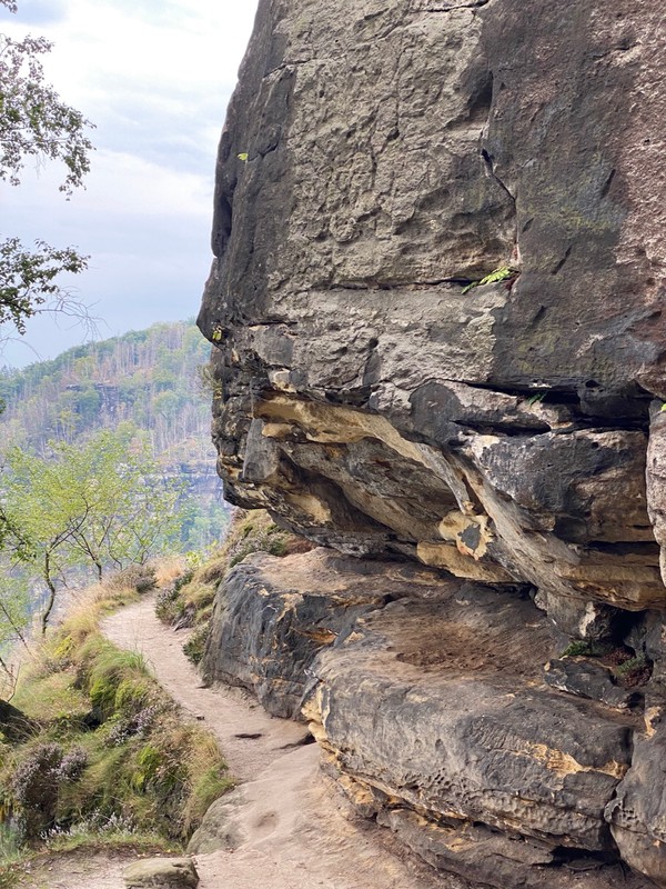This right-turn is easy to miss as there are no indicators and the trail looks a bit “grown in”. Maybe to stop too many people from accidentally going towards the climbing areas? I don’t know. But the effect is that I’m completely alone on this path until arriving at the Häntzschelstiege via ferrata.