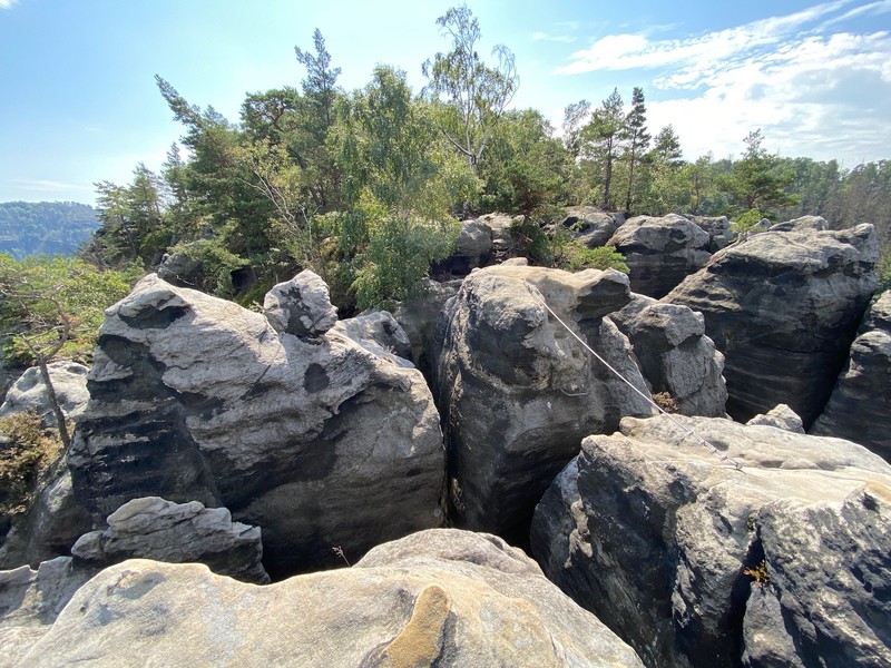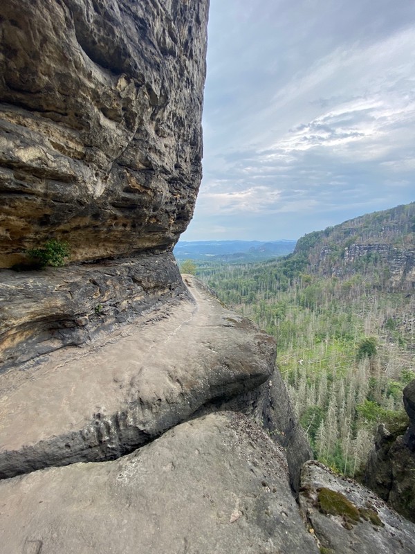 After crossing a few stones (there’s a even a small bridge between two more exposed stone columns) the trail continues and after a short while connects to one of the more frequented routes towards “Carolafelsen” – another nice viewpoint and surprisingly empty when I arrive (one other party).