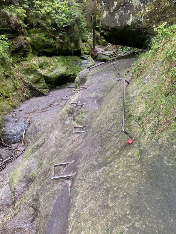The Häntzschelstiege are devided into two parts: the lower and upper part. To enter the lower part you have to scramble up a few meters to reach the first iron step. From then on you generally have very good coverage of cables along the whole route (the via ferrata is rated as B).