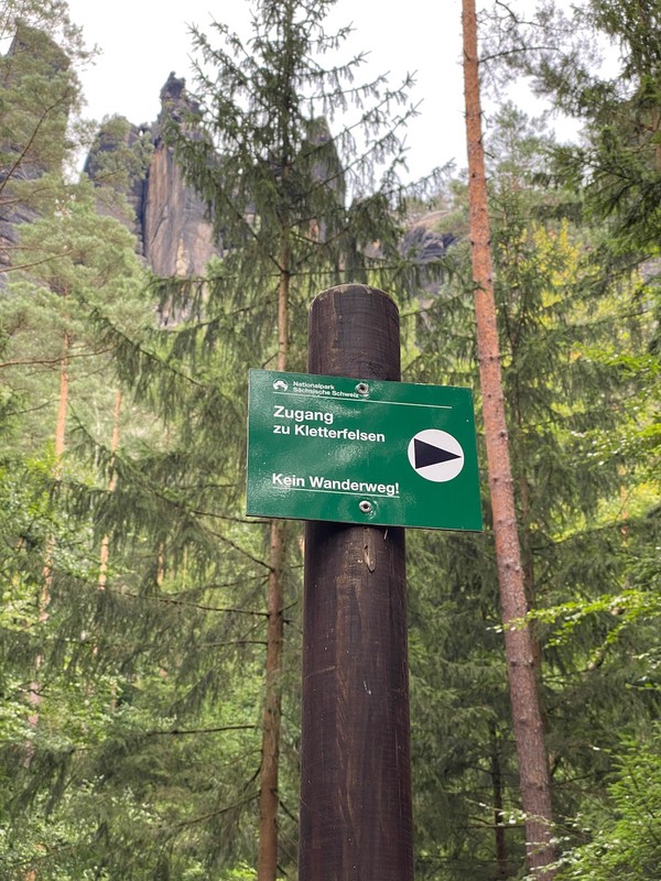 The signpost in the direction of the via ferrata just says “Zugang zu Kletterfelsen – kein Wanderweg”, which means something like: access to the climbing crag – no hiking trail. This includes the via ferrata and is not just for rock climbing.