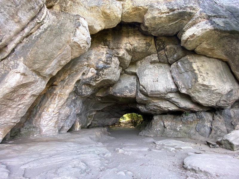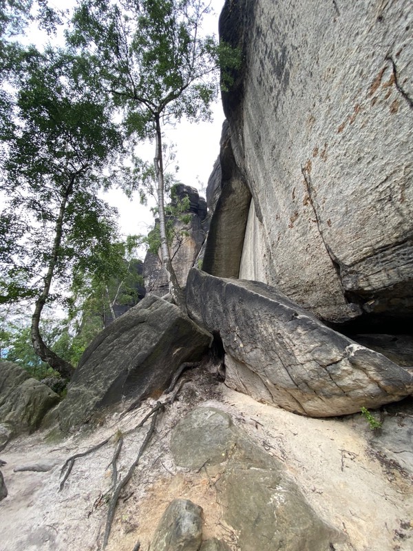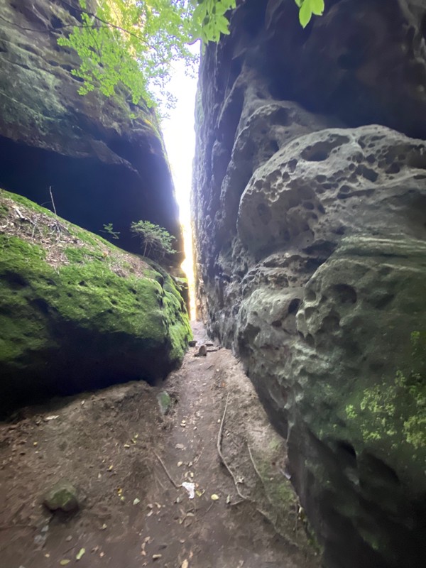 I follow along the Obere Affensteinpromenade for a while, cross the fork again where I got lost on the way out and pass multiple nice view points. After a turn to the Reitstieg I make my way to the Idagrotte, a cave at the Frienstein rock, through quite rocky terrain with a few trials and errors to find the right way.